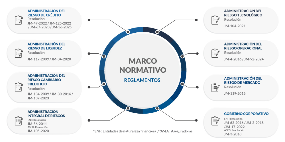 Bienvenido a este apartado. En este apartado podrá encontrar información sobre el marco legal y normativo que respalda a la Metodología de Supervisión Basada en Riesgos que aplica la Superintendencia de Bancos, específicamente sobre las disposiciones reglamentarias que deben aplicar las entidades supervisadas en la gestión de riesgos y gobierno corporativo.
